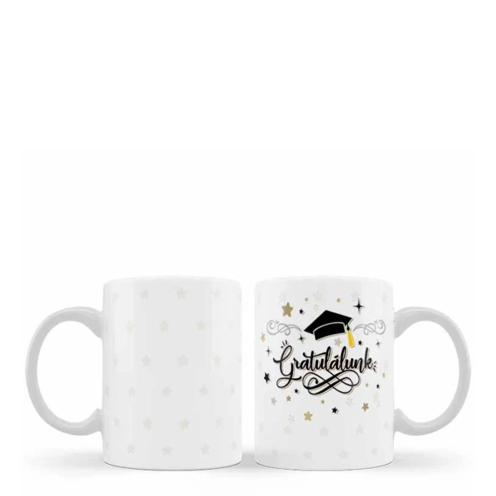 Bögre ballagásra: Gratulálunk felirattal, fekete,fehér,arany színekkel.