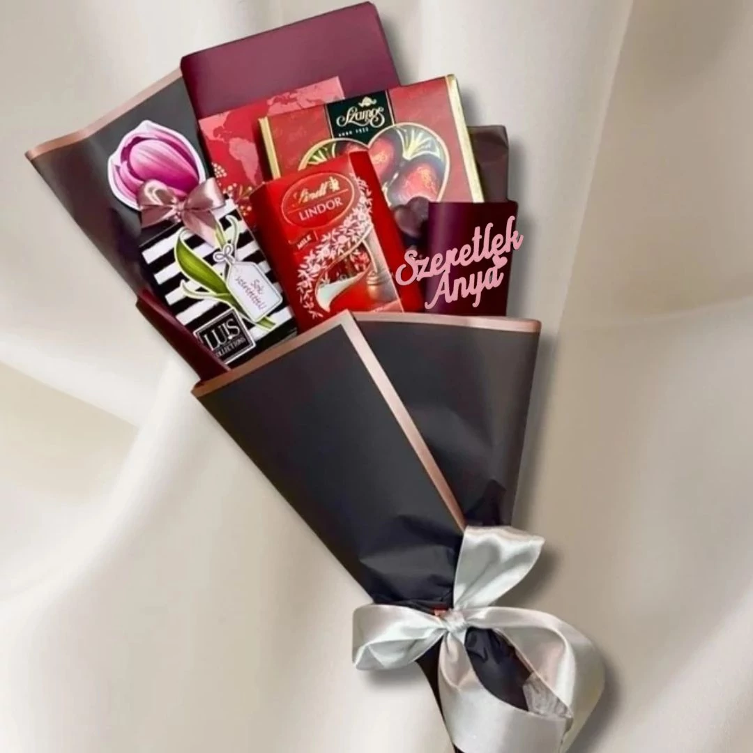 Étcsokoládés áfonya: Gyönyörű tulipános díszcsomagolásban. Csokoládéval bevont, prémium minőségű áfonya, 59% étcsokoládéval. „Sok szeretettel” felirattal.