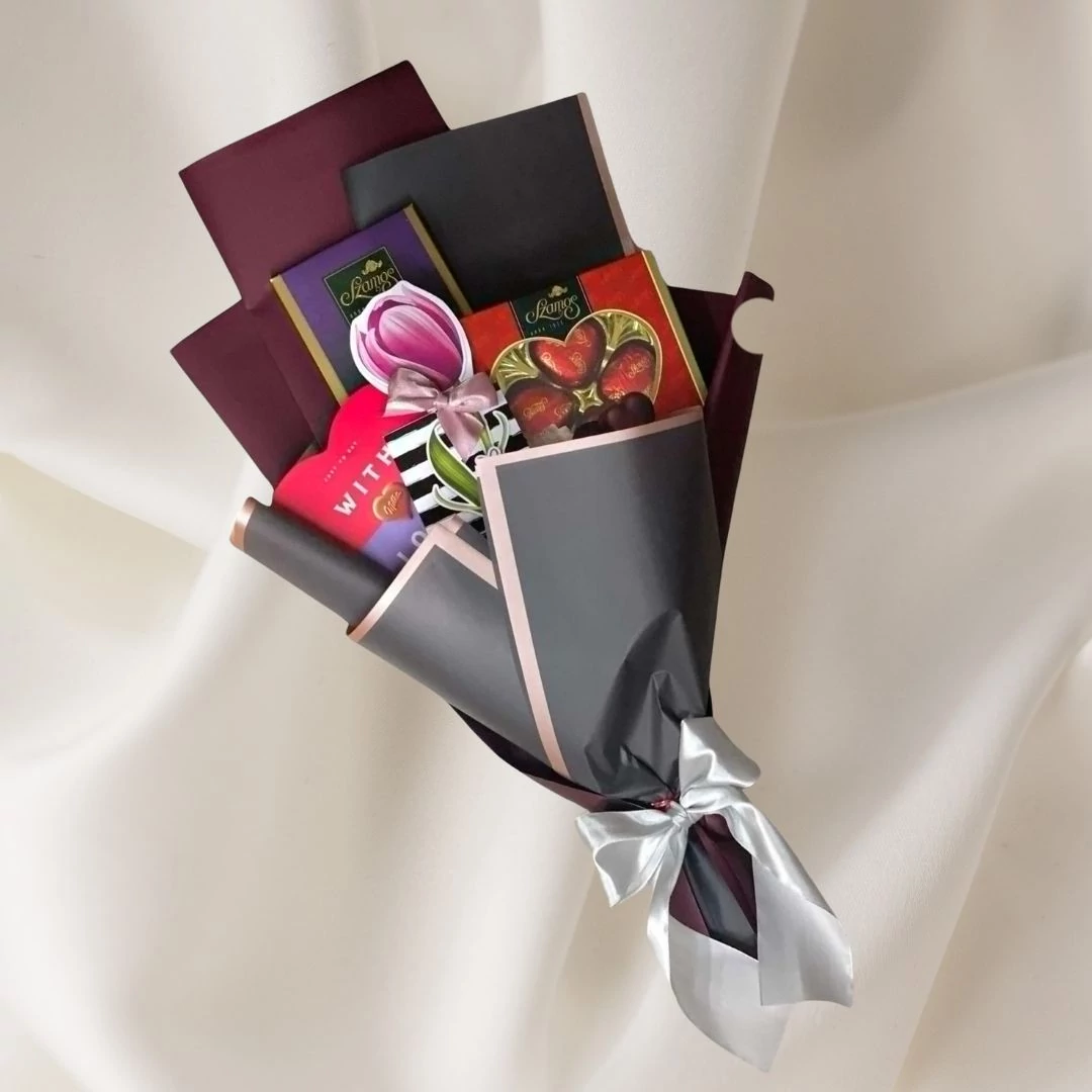 Étcsokoládés áfonya: Gyönyörű tulipános díszcsomagolásban. Csokoládéval bevont, prémium minőségű áfonya, 59% étcsokoládéval. „Sok szeretettel” felirattal.