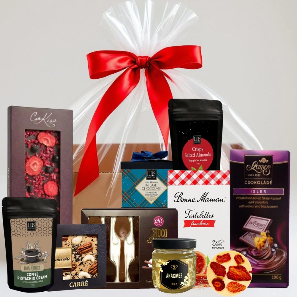 Kényeztesse szeretteit egy exkluzív édesség kosárral, amely a legmagasabb minőségű termékeket tartalmazza, így garantálva a felejthetetlen gasztronómiai élményt.