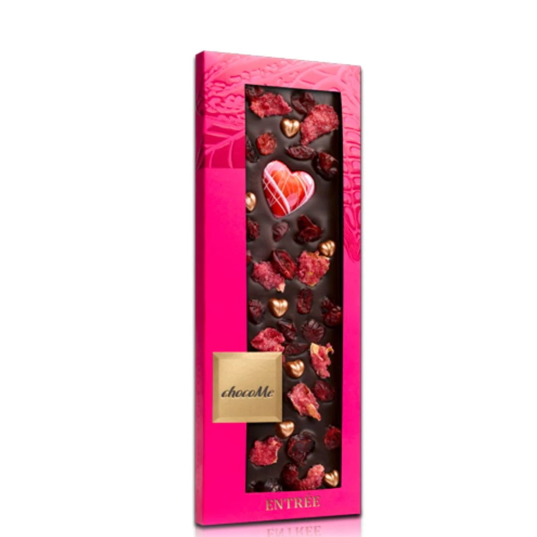 Kézműves kandírozott rózsaszirmos étcsokoládé: Ez a színpompás étcsokoládé, bronz színű étcsokoládé szívekkel, kandírozott rózsaszirommal, fehércsokoládé szívvel, aszalt vörösáfonyával tesz különlegessé bármely alkalmat.
