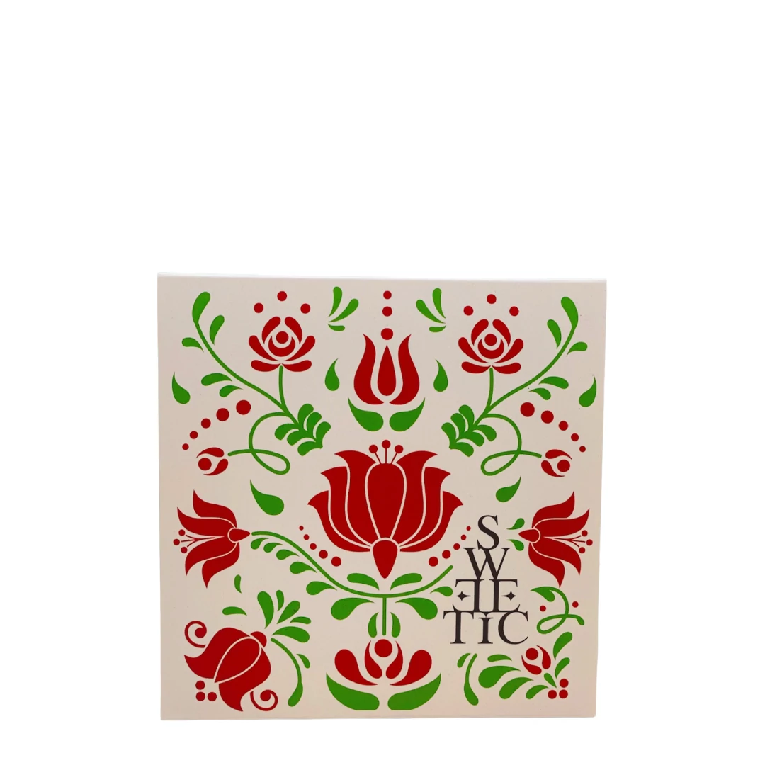 Étcsokoládé pálinkás aszaltmeggyel: 73%-os étcsokoládé pálinkás aszaltmeggyel magyaros csomagolásban.