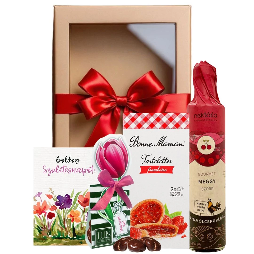 Ajándékozzon örömet és meghitt pillanatokat egy gondosan összeállított ajándékcsomaggal, amely válogatott finomságokat és frissítő italokat tartalmaz, ideális választás lehet a hölgyek számára, akik szeretnék megünnepelni a születésnapjukat. Ez a különleges ajándékcsomag ideális választás lehet bármilyen alkalomra, amikor szeretné megajándékozni szeretteit egyedi és emlékezetes módon. A személyre szabott üdvözlőlap pedig tovább növeli az ajándék értékét.