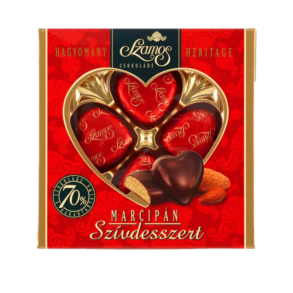 Szamos marcipán szív: Desszertmarcipán, csokoládé bevonattal, a szeretet szimbóluma.