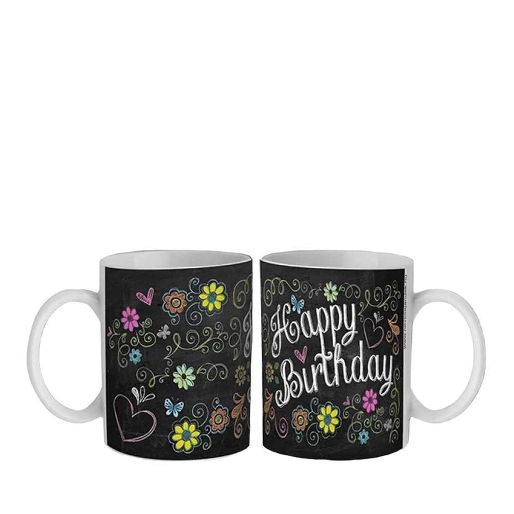 Születésnapi bögre: Happy Birthday felirattal virágos háttérrel